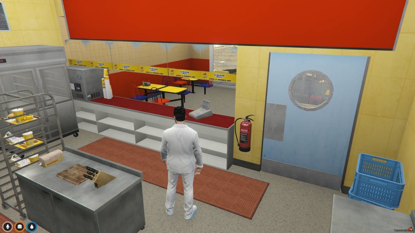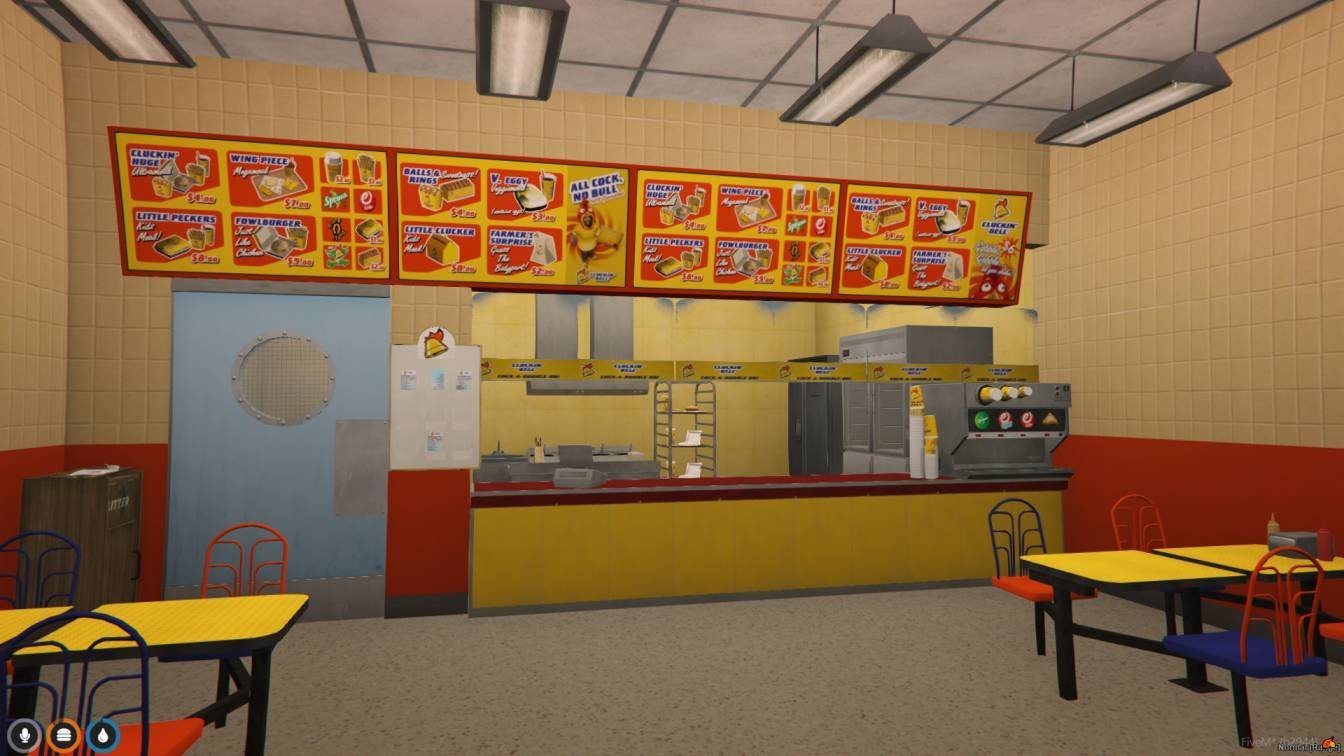 The FiveM Cluckin Bell MLO is like stepping into a virtual version of the fast-food joint from GTA V. It’s a fun place where players can pretend to order food, cook in the kitchen, or just hang out with friends. The inside looks just like the real thing, with tables, chairs, and a bustling kitchen. You can even drive up to the window and pretend to order from your car!
