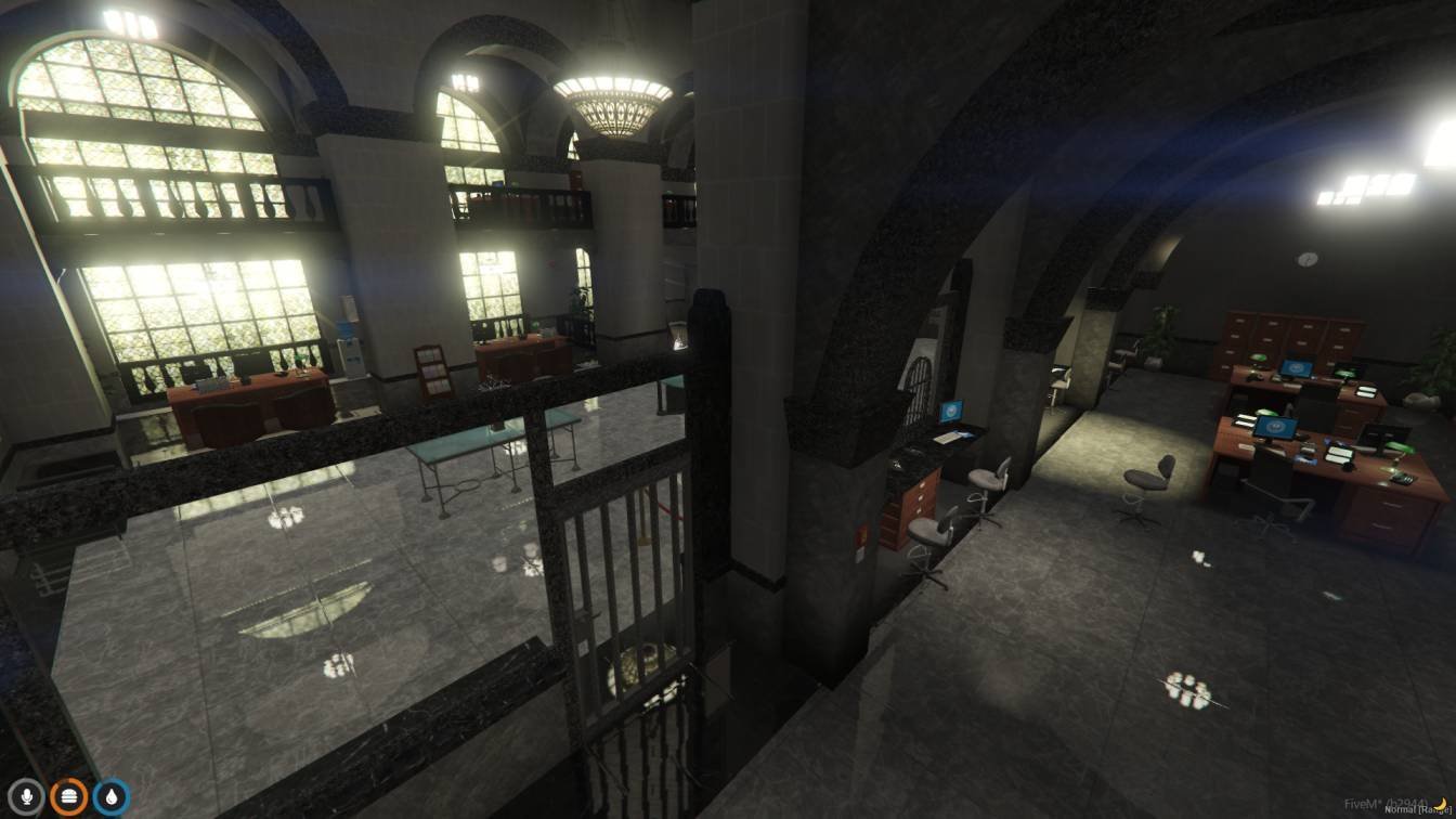 - Detailed interior with vaults, teller counters, and offices